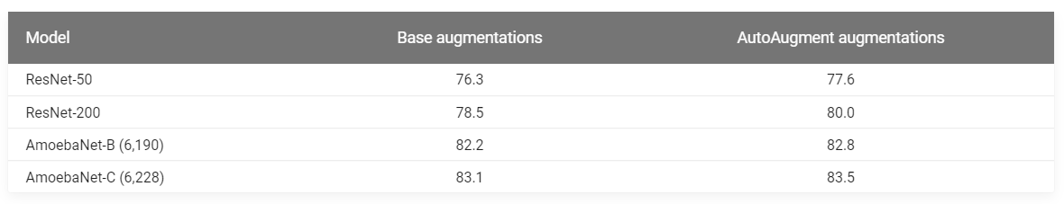 - Image augmentations 방법의 효과( Validation set 기준 Top-1 Accuracy %)
