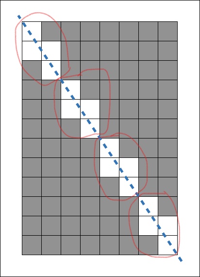 반복구간은 다음과 같으며, 좌상단을 (0,0)이라 생각해보면 (2,3)(4,6)(6,9)(8,12)에서 사각형의 끝점에 닿는 것을 볼수 있다. 즉, w와 h의 최대 공약수만큼 동그라미 블록이 반복되는 것이다.