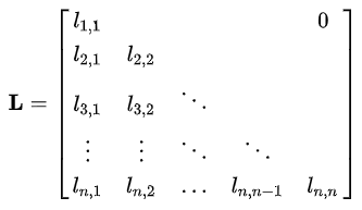 위키백과, 우리 모두의 백과사전. 선형대수학에서, 삼각행렬(三角行列, 영어: triangular matrix)은 정사각행렬의 특수한 경우로, 주대각선을 기준으로 대각항의 위쪽이나 아래쪽 항들의 값이 모두 0인 경우를 의미한다. 다음과 같은 모양을 가지는 행렬 L {\displaystyle \mathbf {L} } 을 하삼각행렬(lower triangular matrix)로 정의한다. L = [ l 1 , 1 0 l 2 , 1 l 2 , 2 l 3 , 1