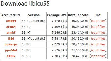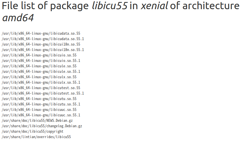 libicui18n.so.55 파일을 우분투 홈페이지에서 관련 패키지를 찾아보면, libicu55 로 나오며 이를 설치하면 해결된다.