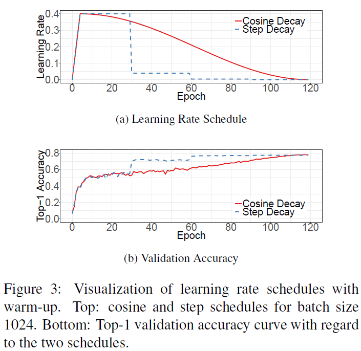 step decay와 cosine decay를 비교해보면 그림 3a와 같다. cosine decay는 시작부터 학습률을 천천히 감소시키며 중간 구간은 대략 선형적으로 감소하고, 마지막 부분에서는 천천히 감소시킨다. step decay와 비교해보면, cosine decay는 학습 시작 후 학습률을 천천히 감소시키지만 잠재적으로 학습 진행 process를 향상시킨다.