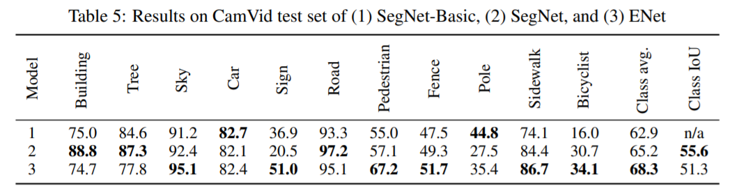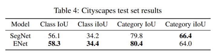 본 논문에서는 빠른 처리 속도와 높은 정확도로 최적화된 신경망을 제안하였다. Post processing을 수행하지 않았고, Compact한 Encoder-Decoder 구조의 빠른 처리속도를 보이고 있다. 제안된 방법은 Cityscapes, CamVid, SUN 데이터 셋에서 평가되었으며 NVIDIA Jetson TX1과 NVIDIA Titan X GPU 환경에서 실험하였다.