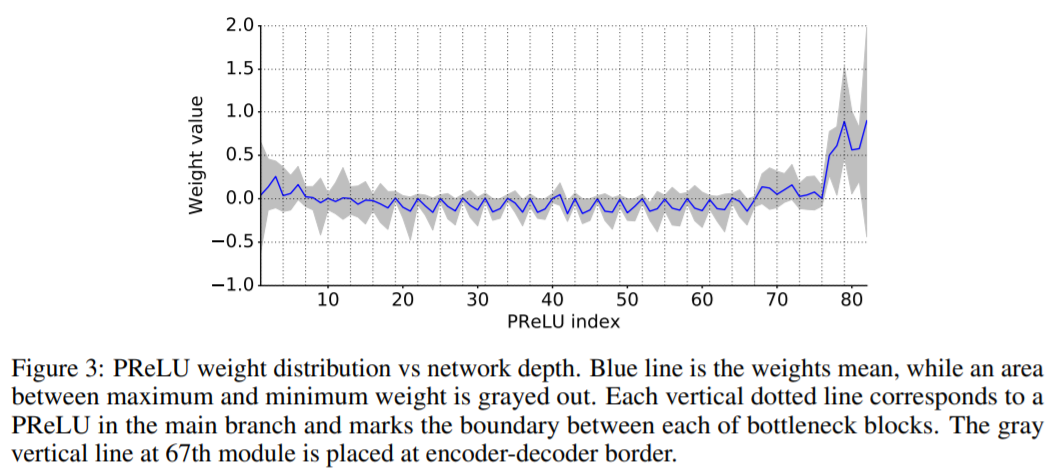 Nonlinear operations : 최근 ReLU와 batch normalization을 사용하는 것이 유익하다고 보고되어 있으며, 네트워크 초기 계층에서 대부분의 ReLU를 제거하면 결과가 향상된다는 사실을 발견했다. 또한, 음의 기울기를 학습하기 위해, ReLU 대신에 PReLU를 사용하여 기울기를 학습하도록 하였다. PReLU의 가중치 분포는 그림 3과 같다.