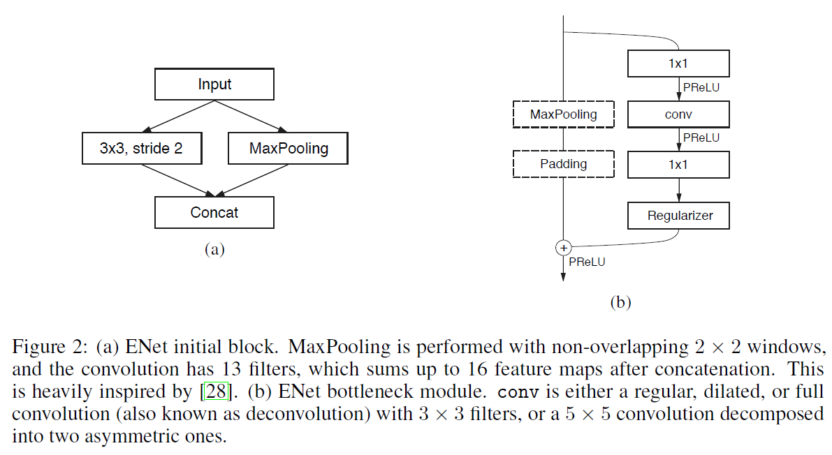 Early downsampling : real-time 연산에서 가장 중요한 것은 입력 프레임에 대해 효율적으로 처리하는 것이며, E-net의 처음 두 블록은 입력 크기를 크게 줄이고 작은 특징 맵 세트만 사용합니다.