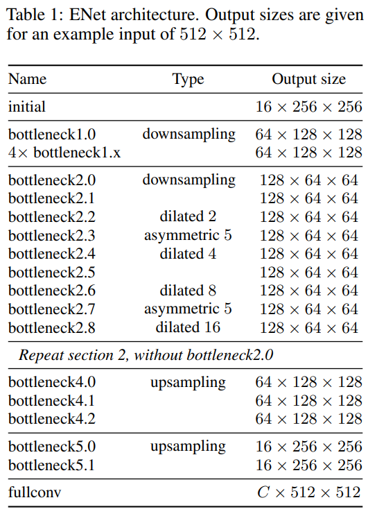 네트워크의 구조는 Table 1과 같다. 결과 크기는 512x512이며, 본 논문에서 사용하는 initial block과 bottleneck block은 다음과 같다.
