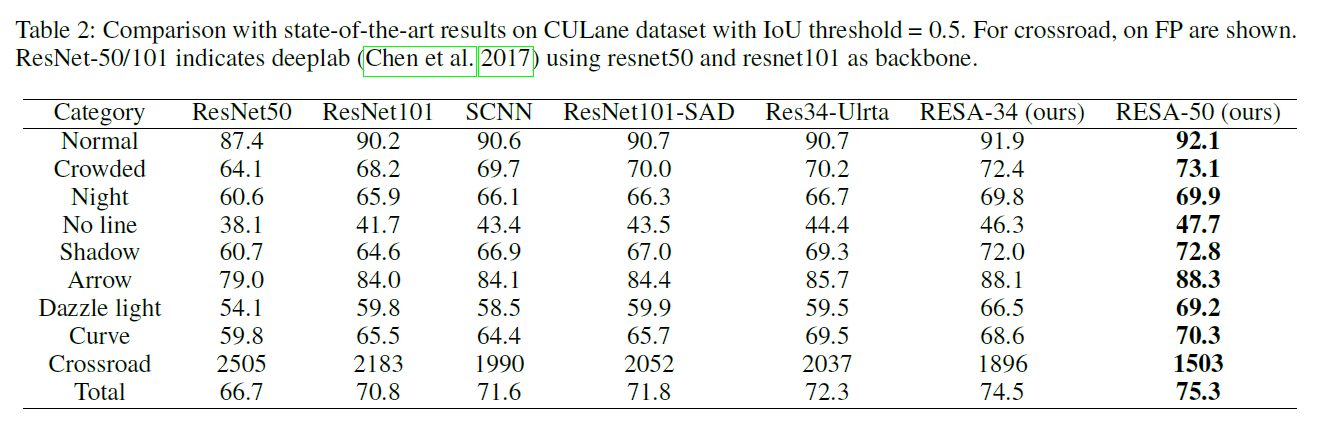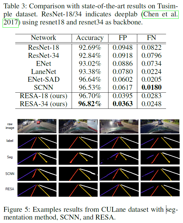 두개의 차선 탐지 데이터 셋(CULane, Tusimple)에 대해 평가하였고, 높은 성능을 보였다. (75.3 F1-measure on CULane, 96.8% accuracy on Tusimple)