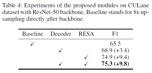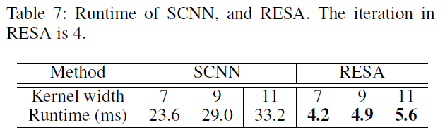 - 다른 네트워크에 쉽게 연결가능하다. RESA의 구현은 간단하며 특징맵에서 인덱스 작업만 필요하다. 둘째, RESA는 특징 향상 모듈로 취급할 수 있는 입력 특징맵의 모양을 변경하지 않는다. 마지막으로, RESA의 계산 시간은 거의 무시할 정도이다.