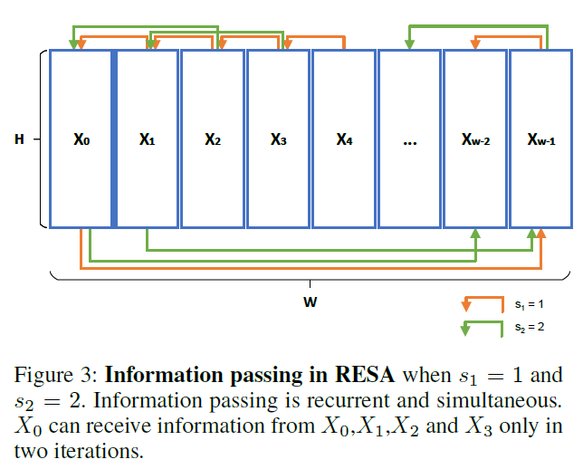 본 논문에서는 RESA를 통해 특징 맵 내부의 정보들을 모으고, 구조적 정보들을 계층들 간의 더욱 직접적이고 효율적으로 이동시킨다. Fig 1.에서처럼 슬라이스된 특징맵에서 수직 수평적으로 이동하며 정보를 모을수 있다. 이러한 RESA는 3가지 특징을 가진다.
