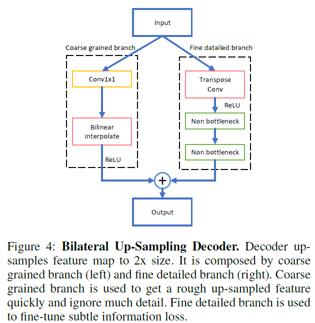 그 후, 제안된 Decoder를 사용하여 bilateral up-sampling 방법을 적용하였다. 두개의 브랜치로 이루어져 있으며 coarse grained 특징과 fine detailed 특징들을 수집한다. Coarse grained branch는 bilinear up-sample을 직접적으로 사용하여 blurry image를 만드는 반면, Detailed branch는 up-sample연산을 transpose convolution와 non-bottleneck blocks [Erfnet: Efficient residual factorized convnet for realtime semantic segmentation.]를 사용하여 정제하였다. 결합된 두 branches는 디코더에서 낮은 해상도의 특징맵이 픽셀단위 예측을 세심하게 할수 있도록 도와준다.