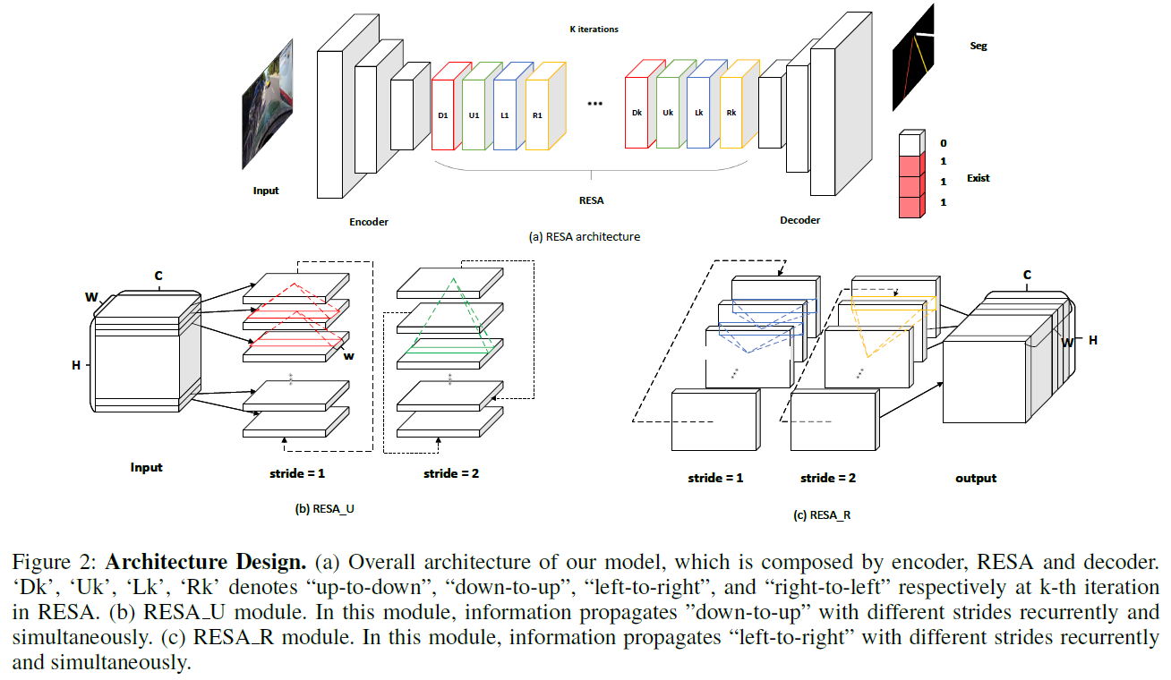 그림 2의 b, RESA_U는 "down to up", "up-to-down" 수직적 이동에 대한 aggregator를 나타내며, "left-to-right" "right-to-left"는 RESA_R, 수평적 이동에 대한 aggregator를 나타낸다.