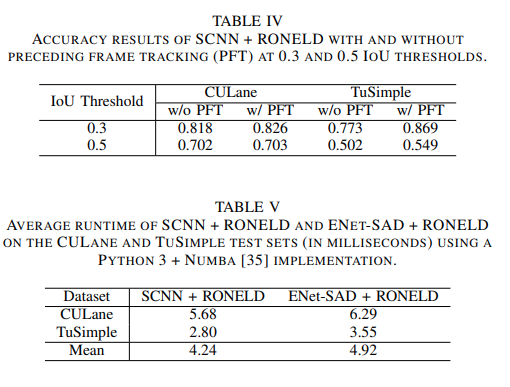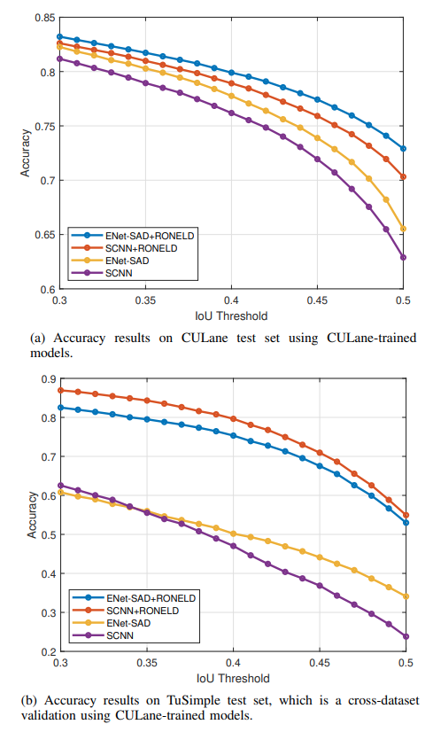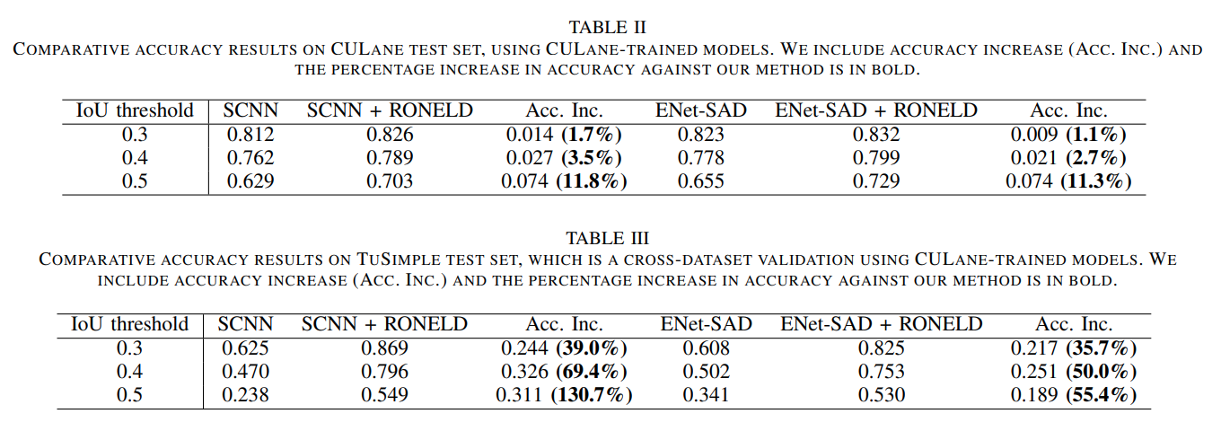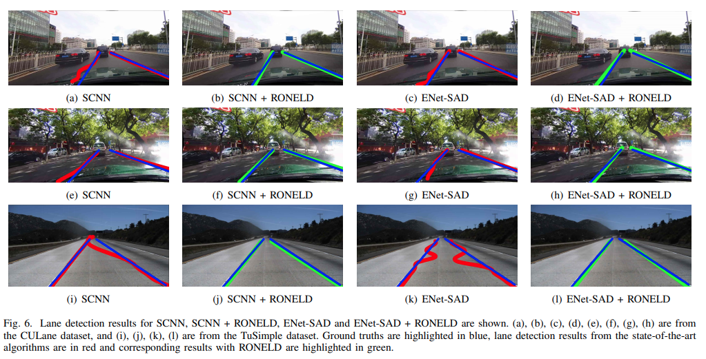 RONELD의 유용성을 확인하기 위해 두가지 딥러닝 모델인 Spatial CNN(SCNN)과 ENet-SAD에서 테스트하고, RONELD의 결과 정확도와 처리 시간을 보여준다. 우리의 실험은 향상된 정확도 성능을 통해 두가지 데이터 셋(Tusimple, CU-Lane)에서 빠른 Run-time과 효율성을 보여준다.