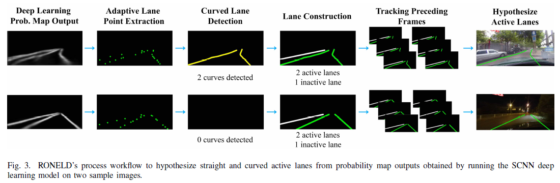 우리는 먼저, 확률 결과 맵(probability map)으로 부터 차선 points들을 추출한 다음, 직선 차선에서 가중치가 적용된 최소 제곱 선형 회귀(Least squares linear regression)를 사용하기 전에 곡선 및 직선 차선을 감지하여 실제 이미지에서 에지 맵 깨짐현상(fragmentation)으로 인한 차선을 수정하였다. 마지막으로, 이전 프레임을 추적하여 실제 active lanes을 가정한다.