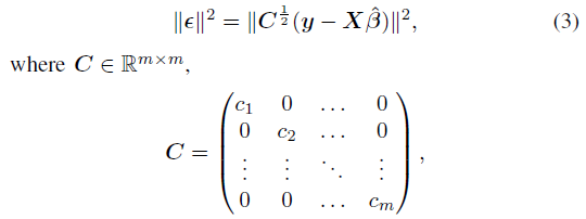 이 문제를 해결하기 위해 더 높은 신뢰도 포인트가 더 정확하게 탐지되는 것으로 가정하므로, 분산이 작은 것이 오류가 더 적다고 할수 있다. 따라서, 출력 확률 맵에서 신뢰도가 높을수록 더 높은 가중치를 할당한다. 선형 모델에 대해 가중 제곱 오차항 $\left \| \epsilon ^{2} \right \|$을 최소화하는 해를 탐색한다. 여기서는 각 차선 점 예측에 대한 가중오차 항을 포함하는 벡터이며 다음과 같다.