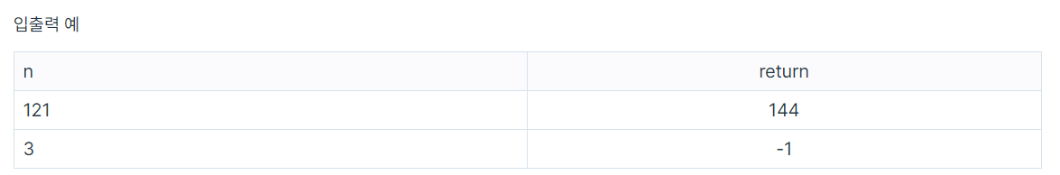 n이 양의 정수 x의 제곱이라면 x+1의 제곱을 리턴하고, n이 양의 정수 x의 제곱이 아니라면 -1을 리턴하는 함수를 완성하세요.